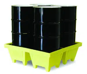 Spill Pallets secondary containment systems are engineered to meet the rigors of today’s regulatory environment. Raised edges on back and sides helps orient barrels on the pallet.