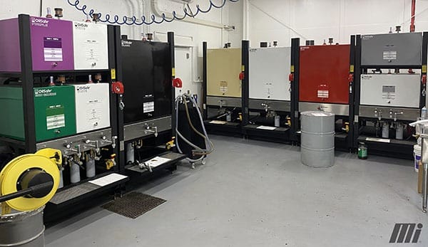 This is an example of a clean and organized lubrication storage room. Investing in larger, color-coded storage tanks for each lubrication type is a good way to ensure fluid cleanliness. Image courtesy Motion
